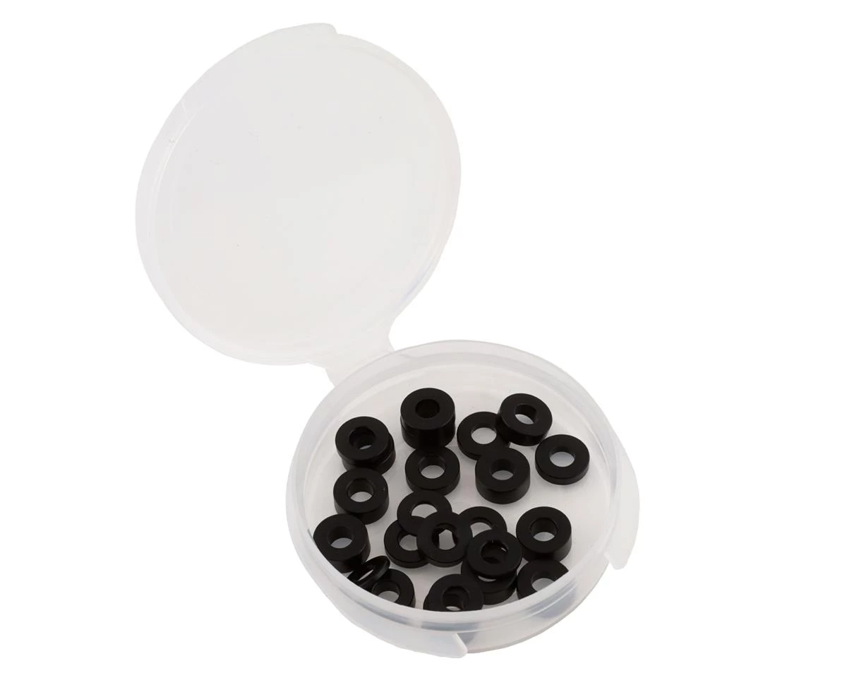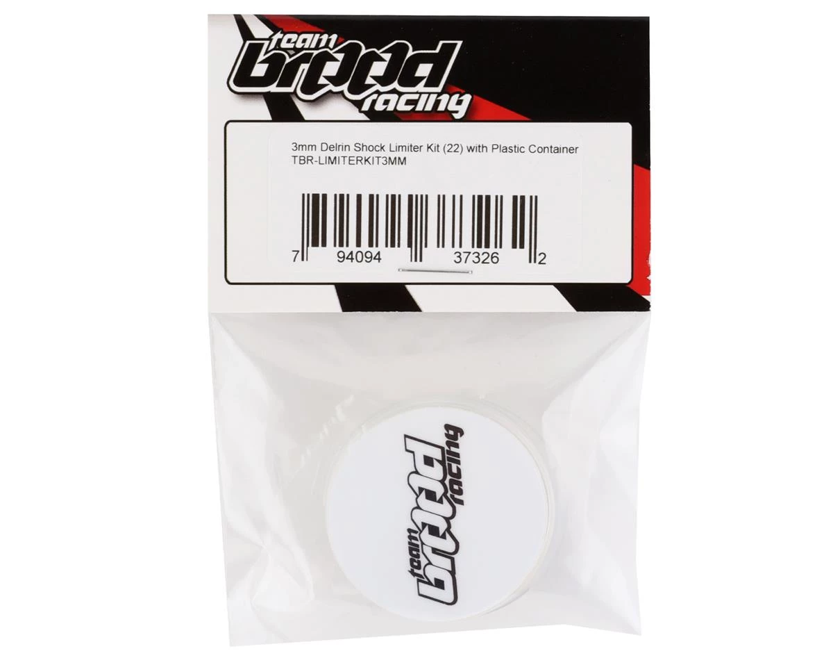 Team Brood 3mm Delrin Shock Limiter Kit with Plastic Container. This is an optional kit intended for vehicles that use a 3mm diameter shock shaft. Made in various sizes to eliminate the need for stacking. Stacking limiters on the inside can lead to the limiters separating and will cause inconsistencies. Stacking limiters on the outside can allow for dirt and debris to get between the limiters, changing your travel. The delrin material will not dent your shock bodies or scratch your shock shafts. The kit includes twenty two delrin shock limiters in various thicknesses providing a wide range of tunability.