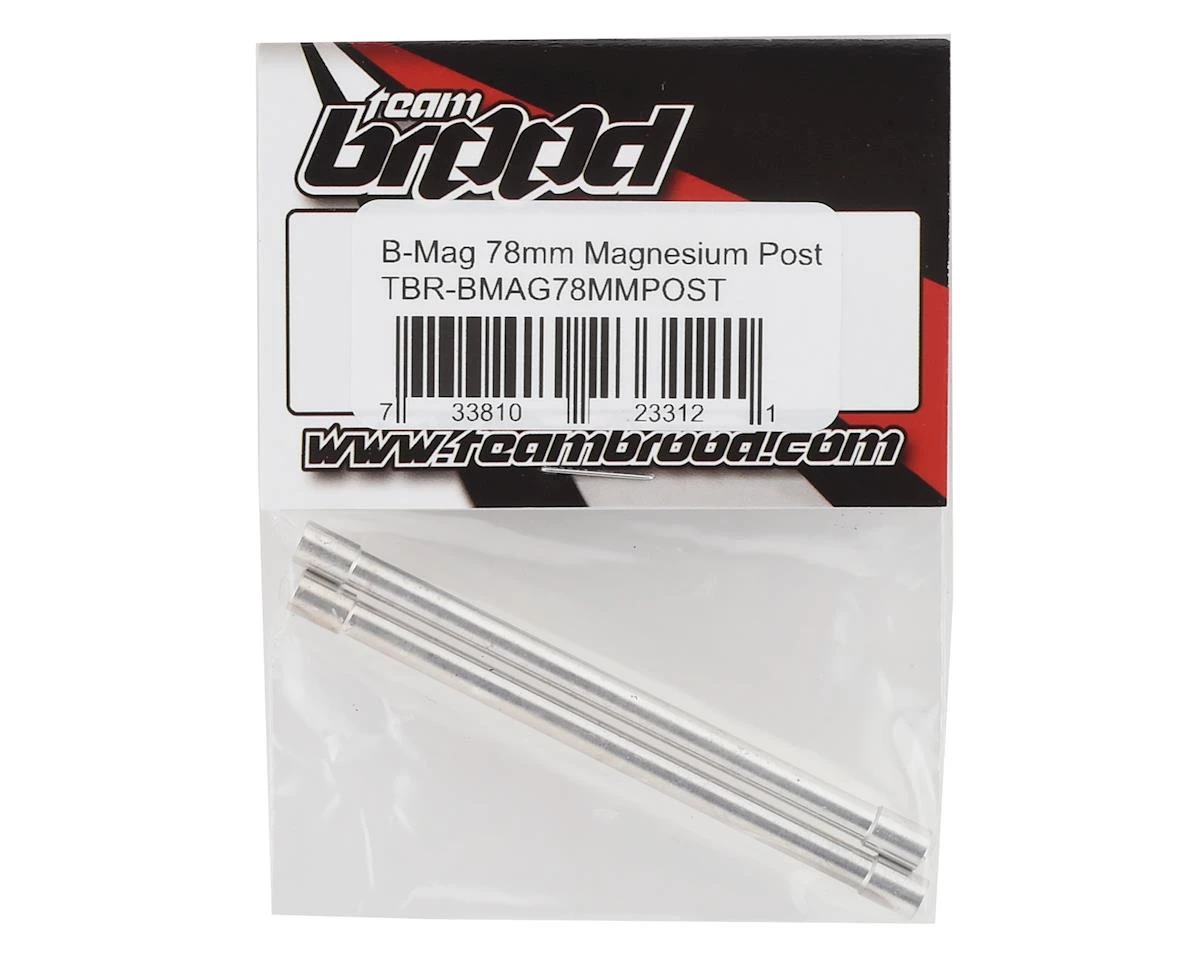 Team Brood B-Mag 78mm Magnesium Posts help to reduce sprung weight on your chassis, without sacrificing strength. These are great to use as braces when installed between front or rear shock hoops, and are also an excellent choice to use as bracing between the chassis rails on custom builds. Package includes two posts. Â