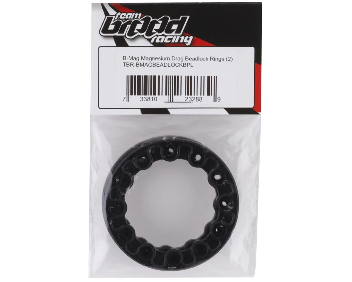 Team Brood B-Mag Magnesium Drag Beadlock Rings fit Pro-Line 2.2/3.0 12-Hole beadlock wheels. These rings are incredibly lightweight and reduce rotating mass without adding additional flex to your setup. The stock rings are nearly 18 grams each, these come in at under 7.5 grams, for a weight savings of 10 grams per wheel! They are ED-Coated Black to provide a durable finish that will not tarnish. Package includes two beadlock rings.Â