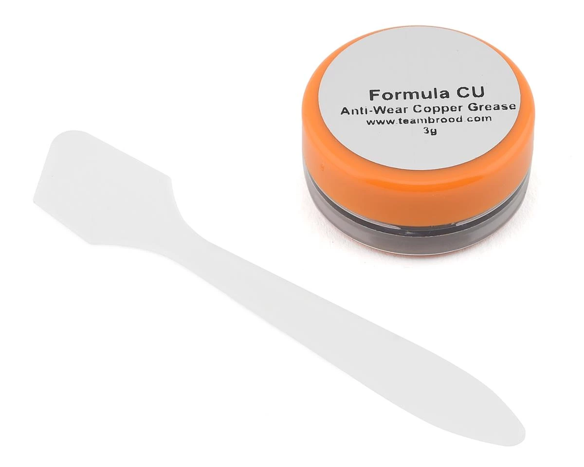 Team Brood Formula CU Anti Wear Copper Grease is a lithium based grease with special additives allowing it to adhere and stay on the surfaces it’s applied to. Its ability to stick to the surface is unrivaled among similar greases. Additional unique additives allow it to prevent oxidation and corrosion, displace moisture all while providing superior lubrication and protection. The copper particles provide additional assistance in oxide and corrosion breakup while still providing good lubrication. Specifically designed in a semi-solid form to allow a combination of cleaning, deoxidizing, protecting and lubricating your parts all at the same time. Can be used on any high wear metal parts such as gears, shafts, cv joints, etc or for threading together dissimilar metals, such as steel screws into titanium.