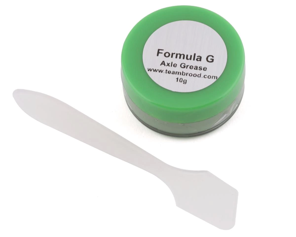 The Team Brood Formula G Axle Grease is a synthetic polymer grease with a special additive that will keep axles moving with less friction and heat. This will lead to less wear while maintaining high performance. Designed with a unique binder to resist high impact, shock loads, wash-out, prevent rust, prevent centrifugal separation and keep grease on the axle. Package includes one ten-gram tub of grease and one applicator.