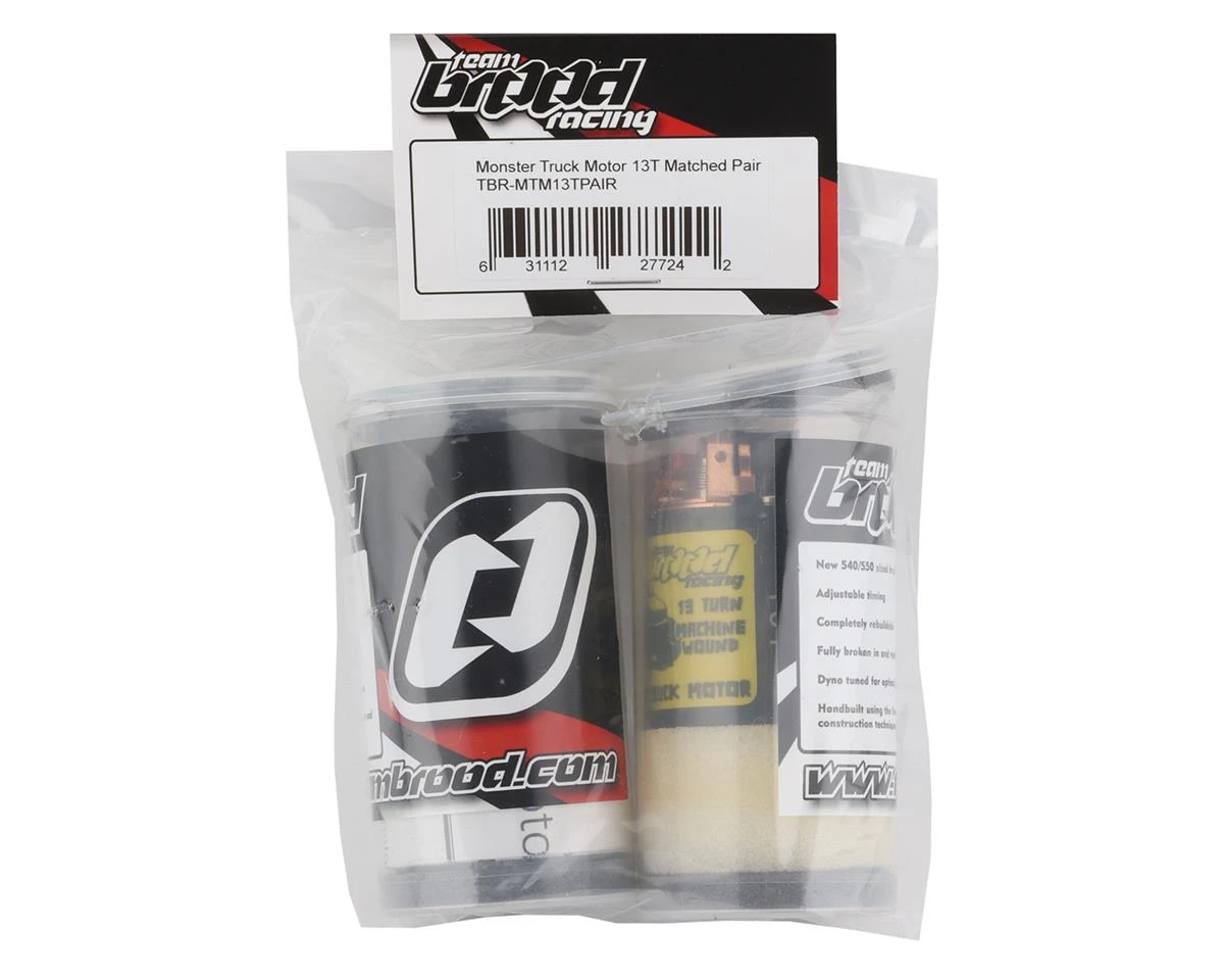 The Team Brood Monster Truck Machine Wound 540 Clod Buster Motor Set was developed for spec Clod Buster racing. These motors are setup as a matched pair, marked with forward and reverse position and tuned to run in sync. The motors are broken in in the correct rotation, set to 0 degrees timing, and are ready to rip right out of the box. Grab a pair and take advantage of the tricks and tweaks that only a veteran motor builder can offer!