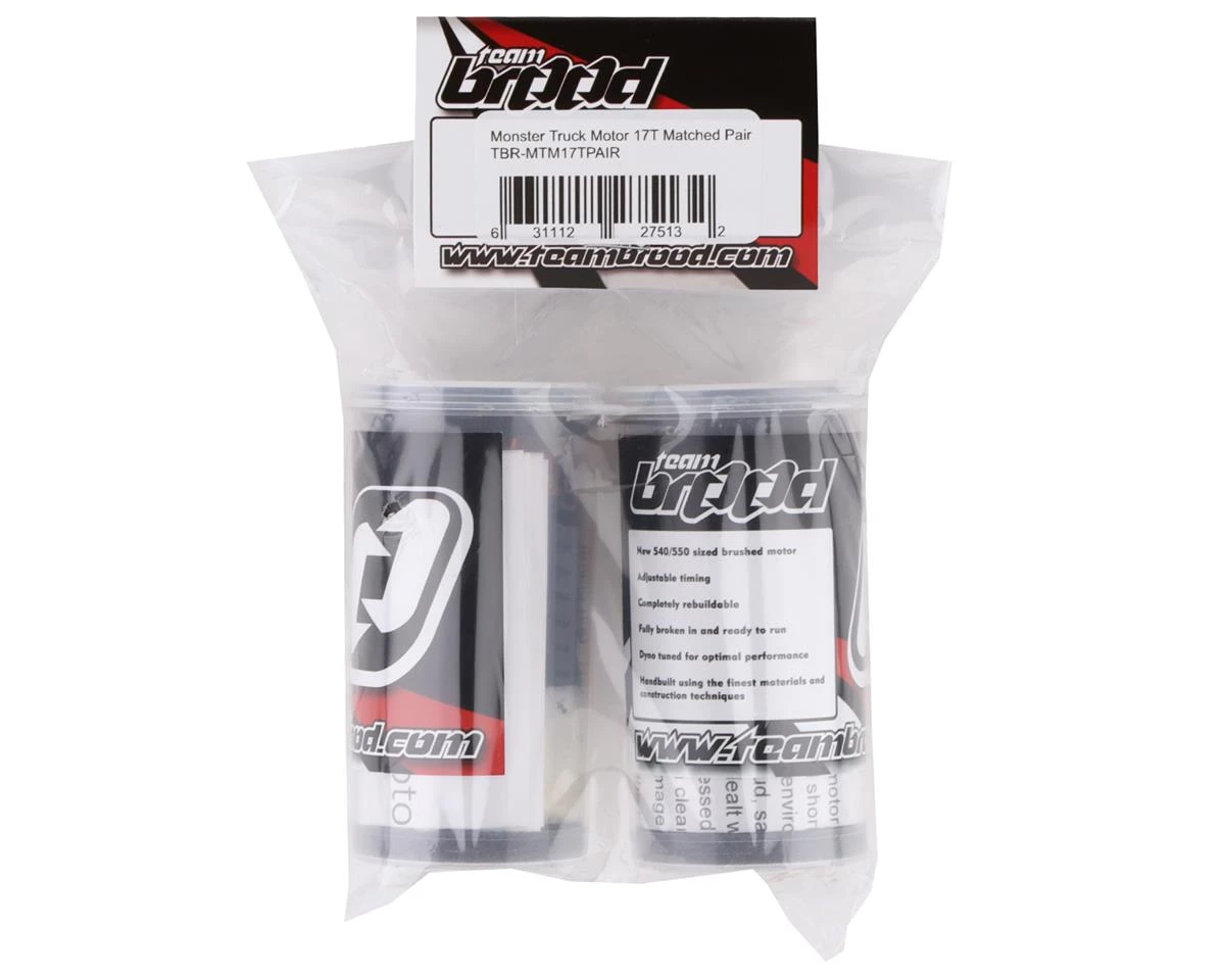 The Team Brood Monster Truck Machine Wound 540 Clod Buster Motor Set was developed for spec Clod Buster racing. These motors are setup as a matched pair, marked with forward and reverse position and tuned to run in sync. The motors are broken in in the correct rotation, set to 0 degrees timing, and are ready to rip right out of the box. Grab a pair and take advantage of the tricks and tweaks that only a veteran motor builder can offer!