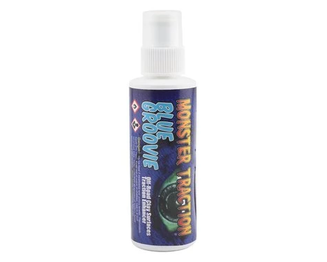 This is a four ounce bottle of Trinity “Blue Groovie” Clay Track Tire Conditioner. Blue Groovie was developed for off road racing on clay, and clay blue grooved tracks. It conditions the rubber and increases grip. It is packaged in a drip top bottle for easy application and includes a small brush for scrubbing the sauce into the tire.
