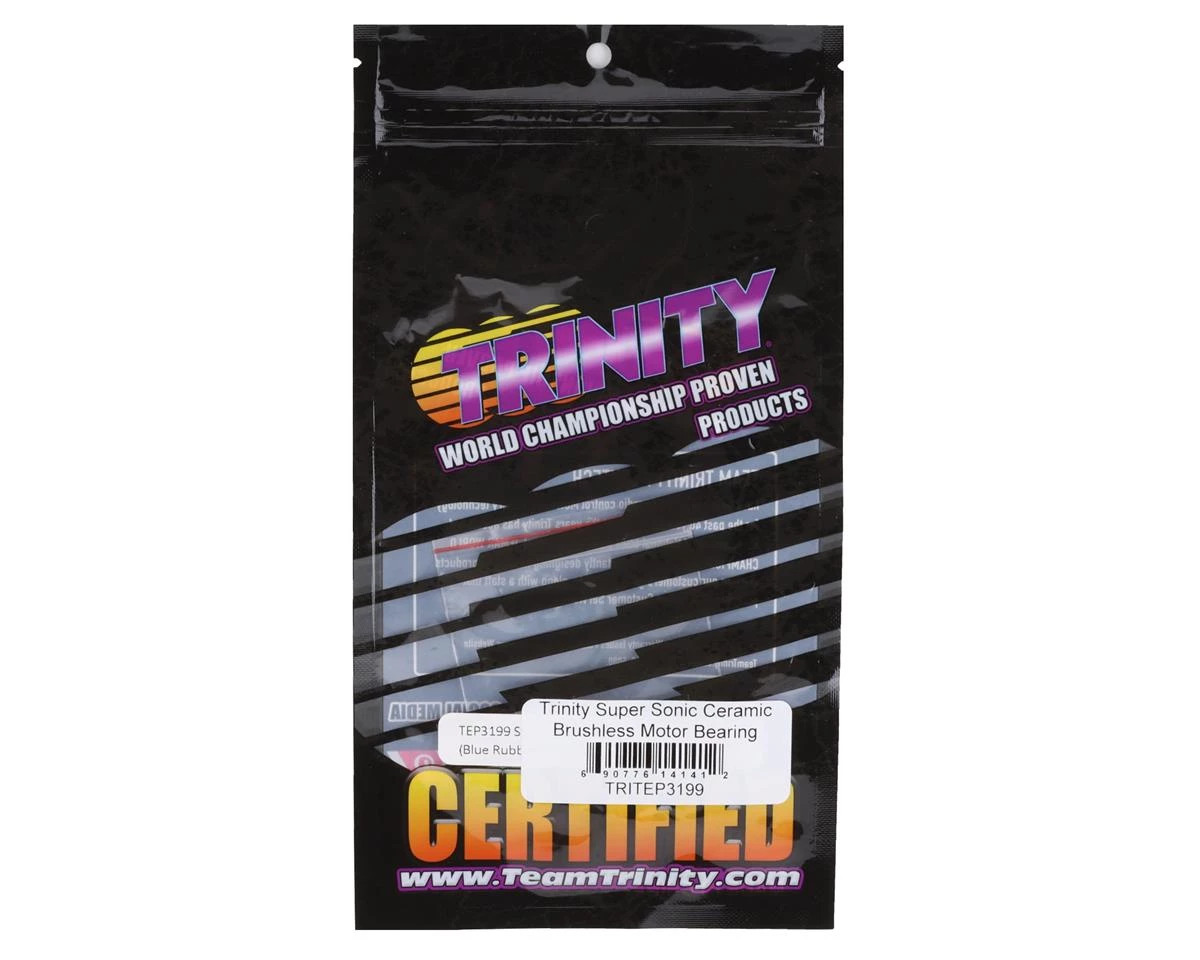 Trinity Super Sonic Ceramic Brushless Motor Bearing. These bearings are assembled with lightweight synthetic oil and are designed to fit the X-Factor, Drag Master, Monster, Punisher and many older brushless and brushed motors. Package includes two super sonic bearings.