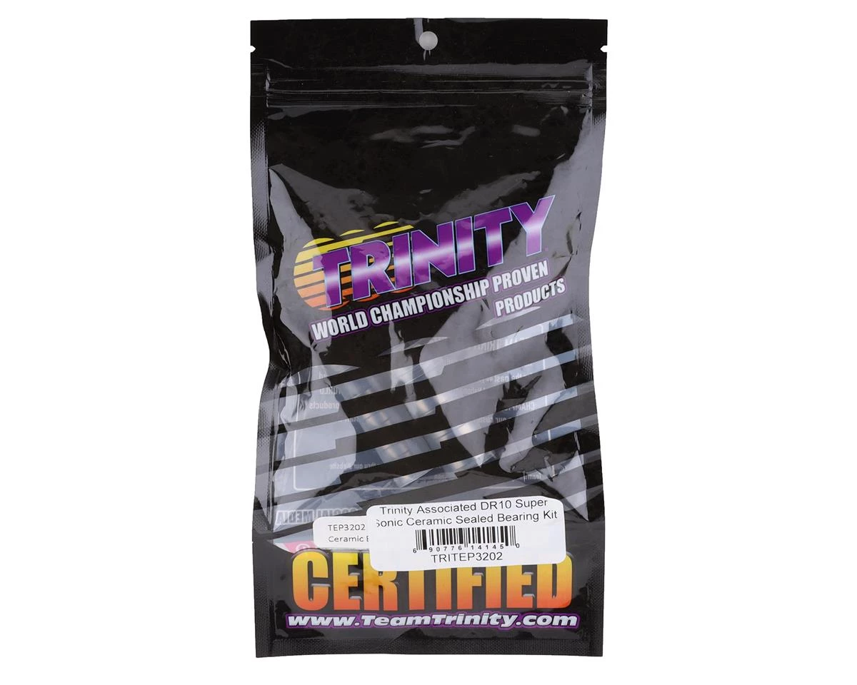 Trinity Team Associated DR10 Super Sonic Ceramic Sealed Bearing Kit. This optional bearing kit has been designed to provide extreme precision and efficiency. These bearings do not require grease and come pre-oiled with a lightweight synthetic oil. Package includes one bearing kit intended for the Team Associated DR10.